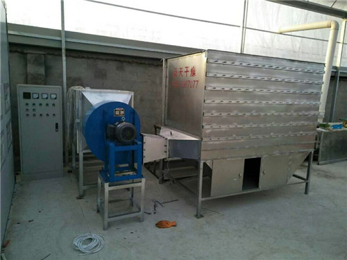 熱源可用電、燃氣。烘干機為七層,烘干箱外側(cè)的每一層都有一個手動搖柄,先把最頂層放上鮮料,攤平;這層物料水分最大,熱風(fēng)與鮮、濕物品接觸,產(chǎn)生大量水蒸汽直接排空,待一定的時間看上去水蒸汽不多后,搖動第一層烘箱手柄,搖到第二層,再把第一層補上鮮料,再隔一段時間繼續(xù)把第一層和第二層搖動手柄把鮮料放到下一層,就這樣依次倫推,循環(huán)翻轉(zhuǎn),逐層烘干。